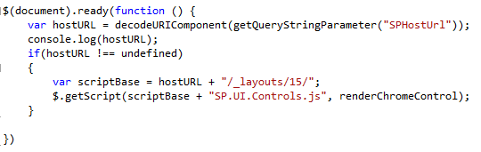 - if the host url is not defined then get the “SP.UI.Controls.Js” file and then run the “renderChromeControl” method. Since the chrome control depends on the sp.ui.control.js, the js file have to rendered before executing the renderChromeControl method.