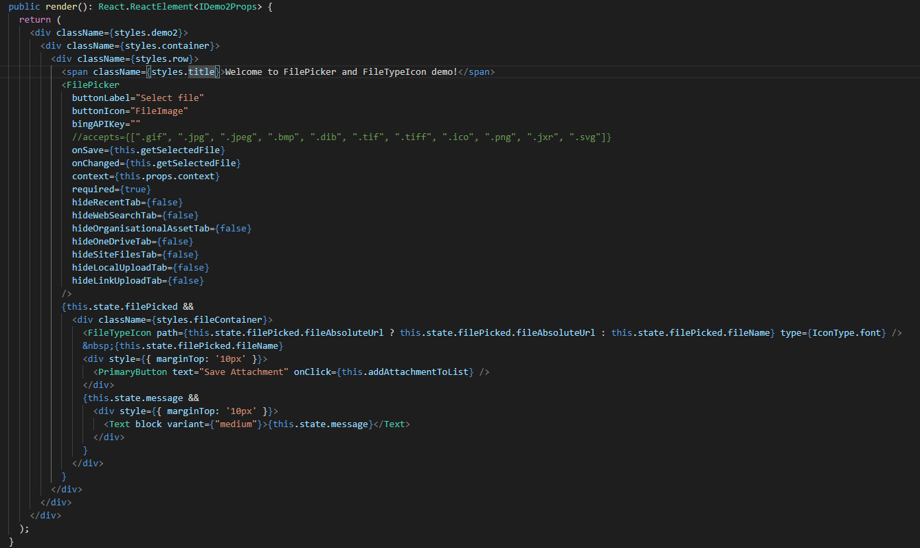 - Don’t be scared of the above code (for beginners), just added the controls with the properties. Checked for the state property filePicked and message, if there is a data then displayed the FileTypeIcon with the filename and also the success message once the file is added as an attachment.