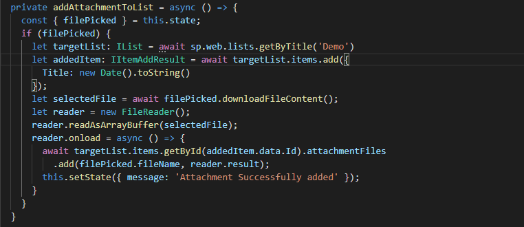 - This method will use the result from the state object, retrieve the file contents using FileReader and then save it to the list item as an attachment.