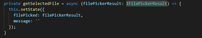 - getSelectedFile method will take the IFilePickerResult and store it in the state.