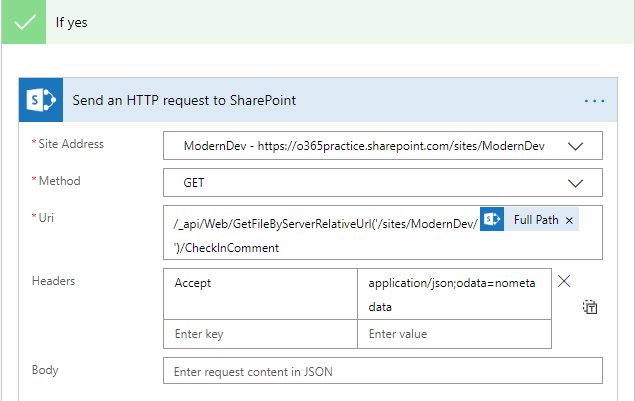 - On the ‘If yes‘ branch, add an action named ‘Send an HTTP request to SharePoint‘ to retrieve the version information for the document.