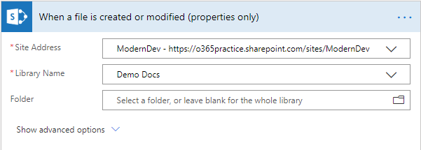 - Next is to configure the flow. Create a flow using ‘When a file is created or modified (properties only)‘ action. Whenever a document is created or modified, the flow will be triggered. Configure the following properties for the trigger action.