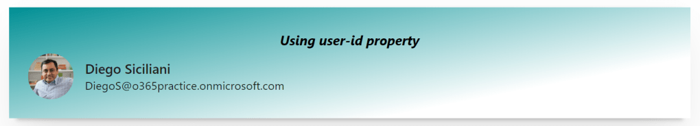 This property can be used with ‘me‘, user name or email. The component will automatically fetch the user details and display the info. If the results retrieved are more than one, the first is always displayed.