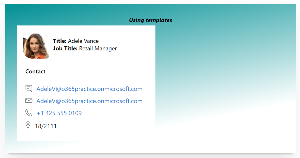 - default – Template to display the information when there is a result returned from the Graph API. The template to customize the entire person card.