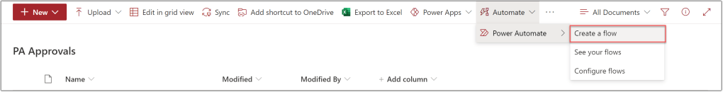 - Choose Automate –> Power Automate –> Create a flow from the library menu.