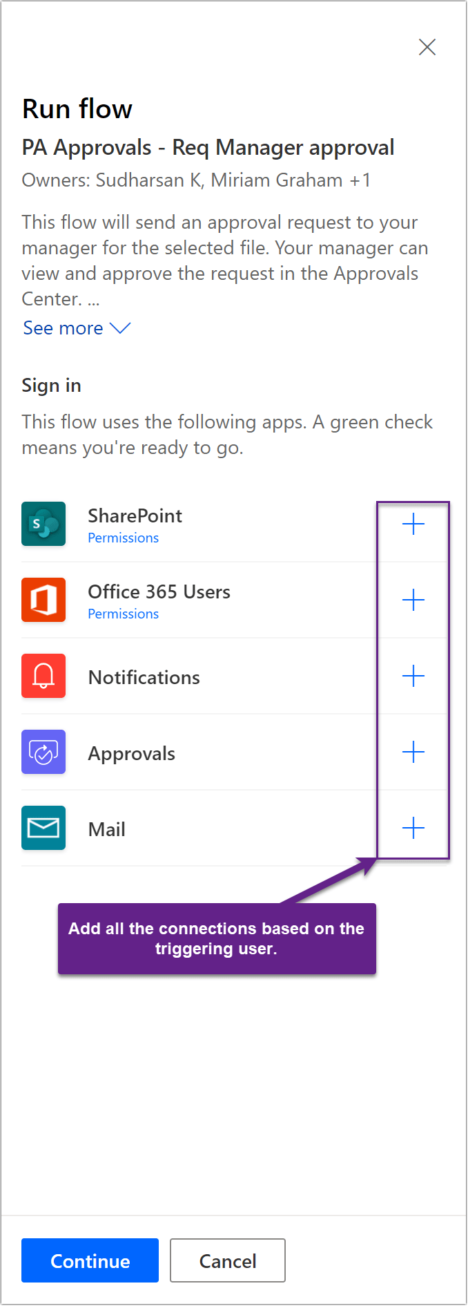 - If the user is triggering for the first time, a panel will be opened to add the connection based on the logged in user. You can also check the permissions requested for each connection.