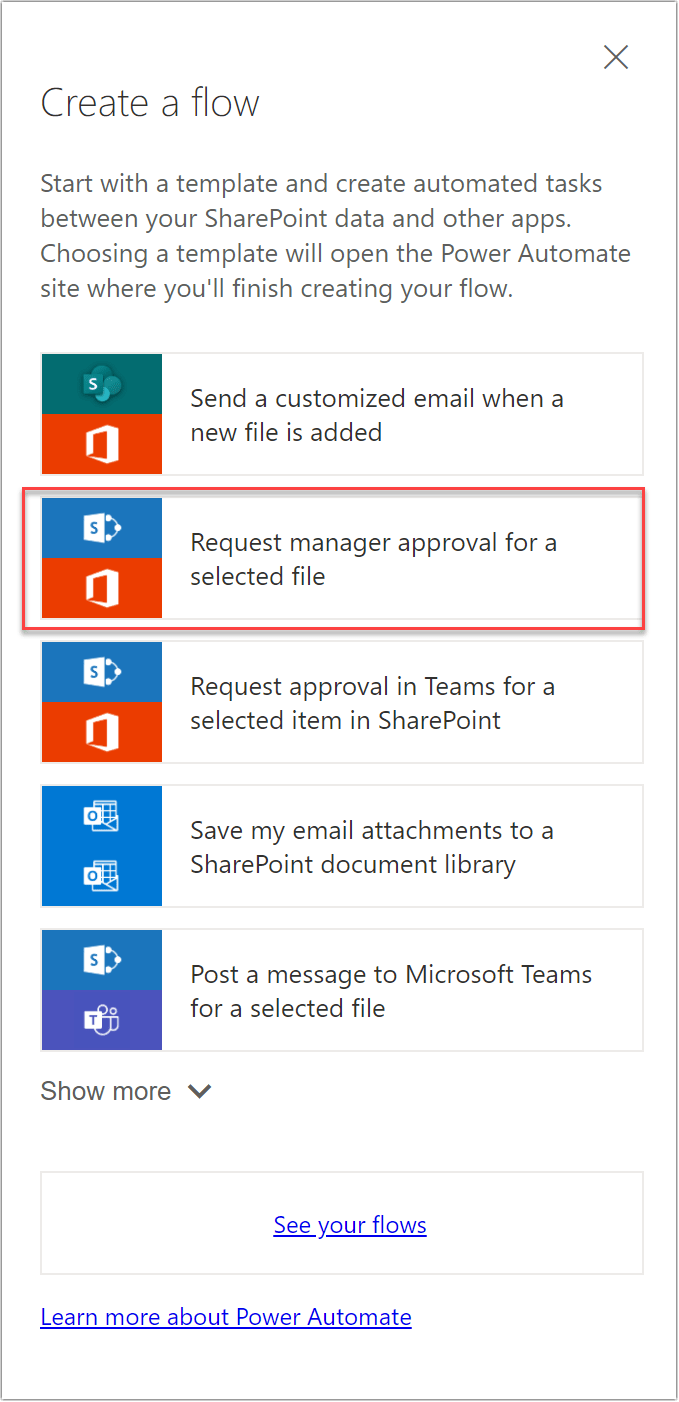 - A panel will be opened with the set of flow templates, select ‘Request manager approval for a selected file‘