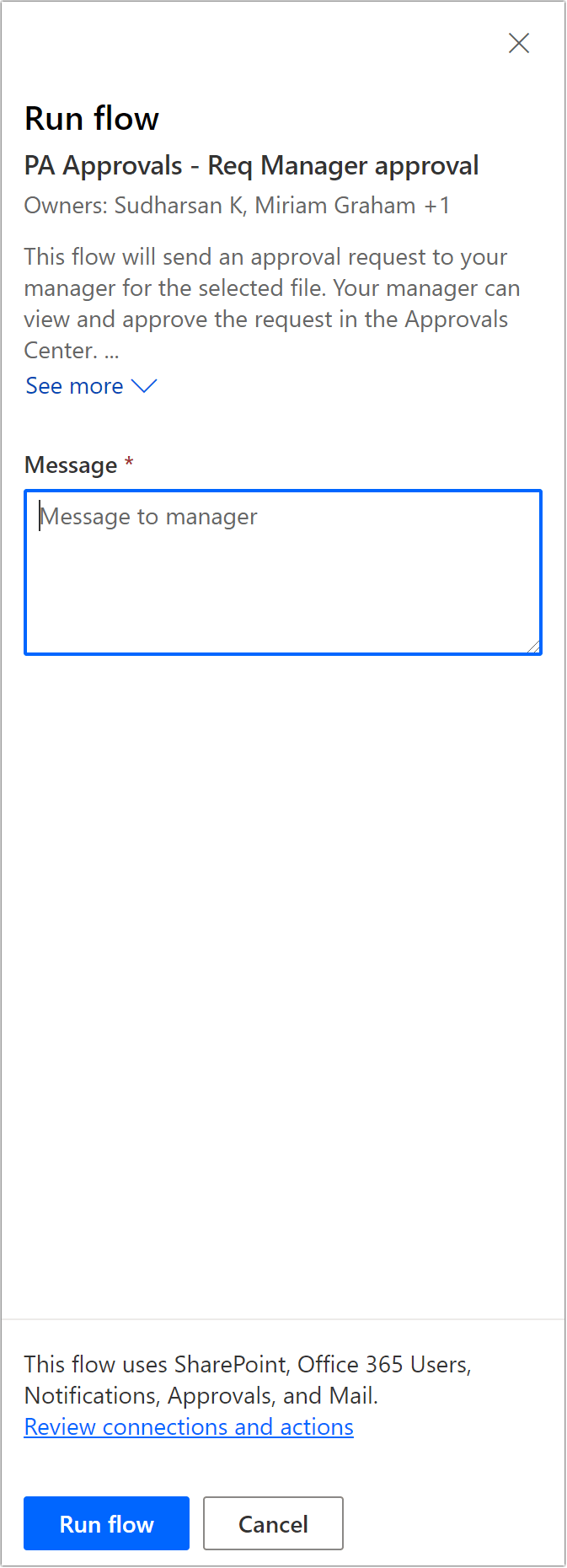 - Enter a message to the approver to start the flow. Click on the Run flow button to start the flow.