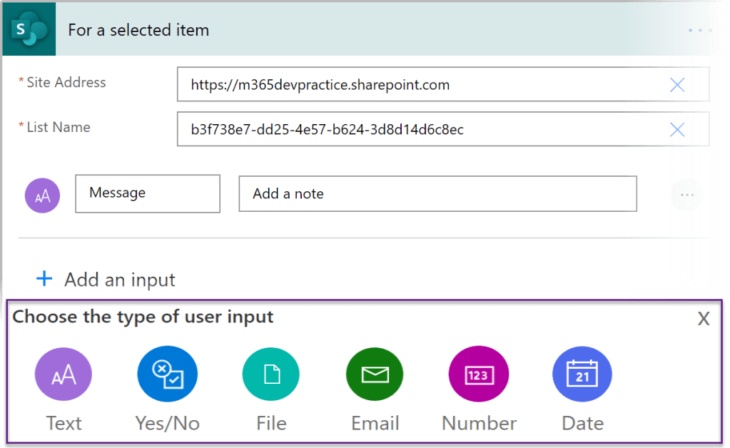 - The flow starts with the trigger For a selected item. When you click on the Submit for approval from the page the flow will start. By default only Message is captured when we trigger the approval. If you want to capture any other information, you can use the below listed User Inputs to capture the info while submitting the page for approval.