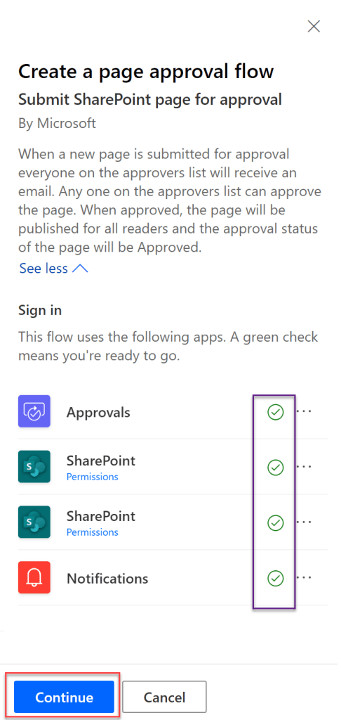 - Once the Create flow button is clicked, you will see another panel showing all the connections required to set the flow. Make sure that all the connections are approved and a tick mark is present for all the connections. If all ok, then click Continue button.
