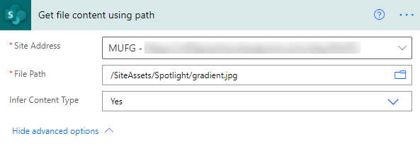 The first action is to get the image. In this demo, I have used the SharePoint action to get the image from SiteAssets library. The same approach can be used in combination with OneDrive using Get file content using path for OneDrive. The output of the action is the binary content of the file.