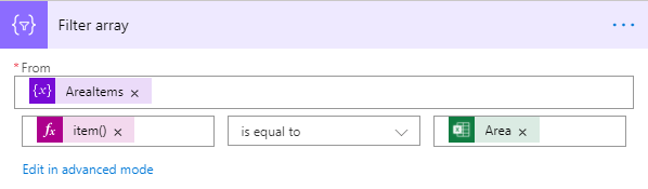 The value to be compared is the value from the excel workbook, so the expression should be items(‘Apply_to_each’)?[‘Area’]
