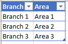 There are list of branches provided as a data in an excel workbook with the branch and area names. The excel is stored in Onedrive folder. Sample items is shown below. In order to retrieve the items from the excel workbook, make sure you convert the sheet into a table format.
