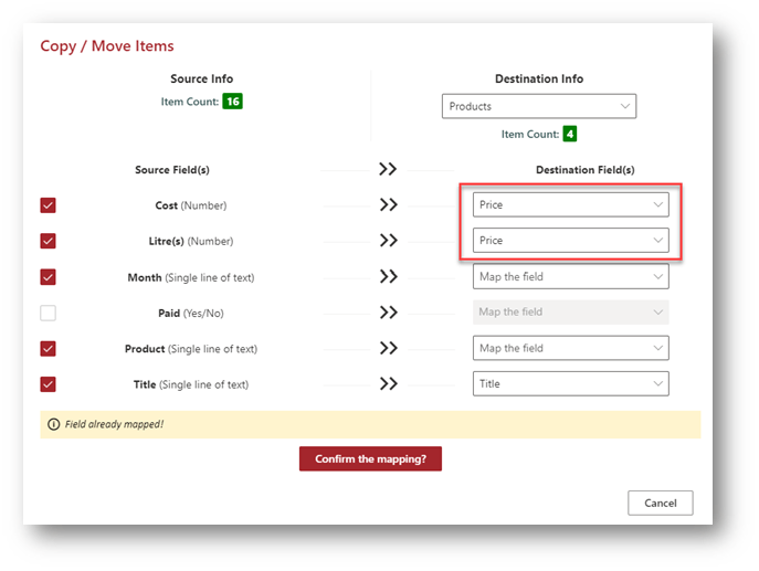 - Once the fields are mapped, you can click the Confirm the mapping? button and if the validations are passed you can Copy or Move the items.