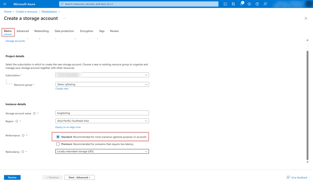 - Redundancy – I chose LRS and you can choose based on your requirement