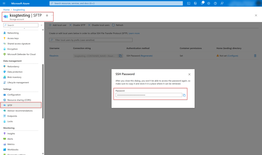 - SFTPUsername: <resource group name>.<container name>.<username>
