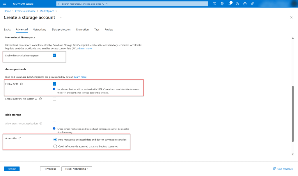 - Enable hierarchical Namespace – This is mandatory for enabling SFTP protocol to the storage account