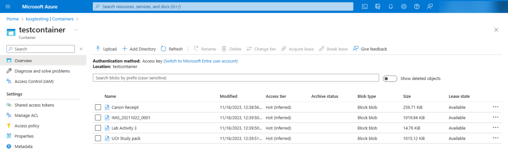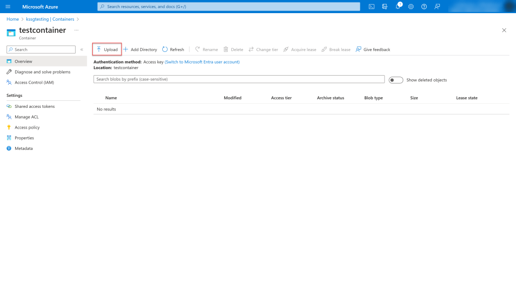 - Once the container is created, you should be able to upload the files directly in Azure.