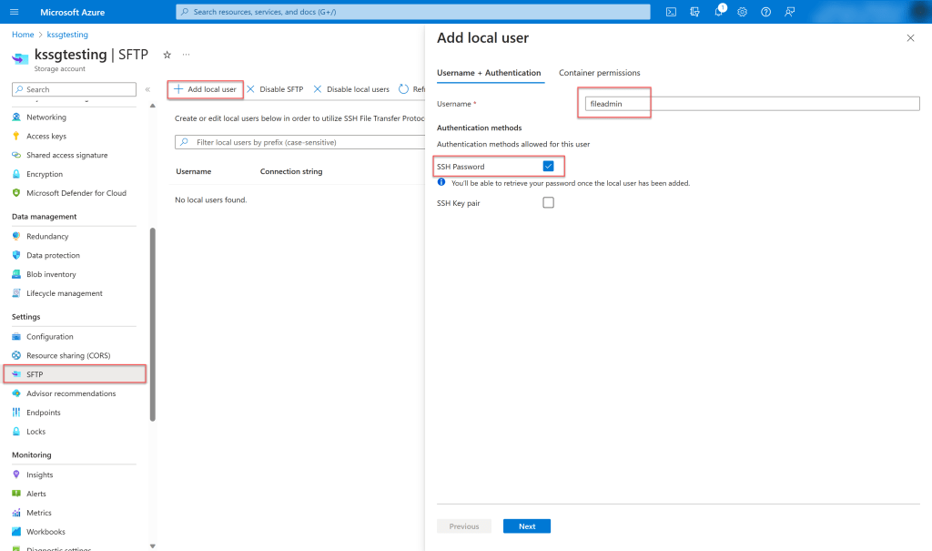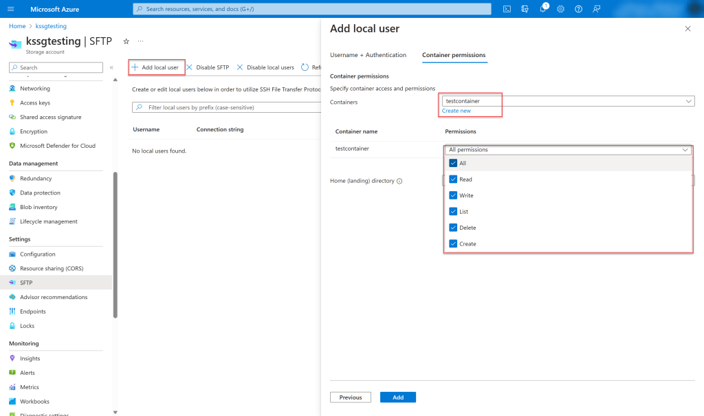 - Now we need to create a local SFTP user and password and map the container permission for us to access and upload the files to the container via Console application.