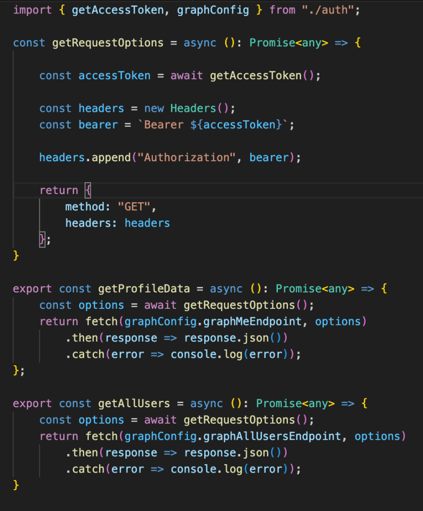 There are few other variables and method declared in the auth.ts file to support the application. Below is the graph endpoint variable to access the information from the graph API.