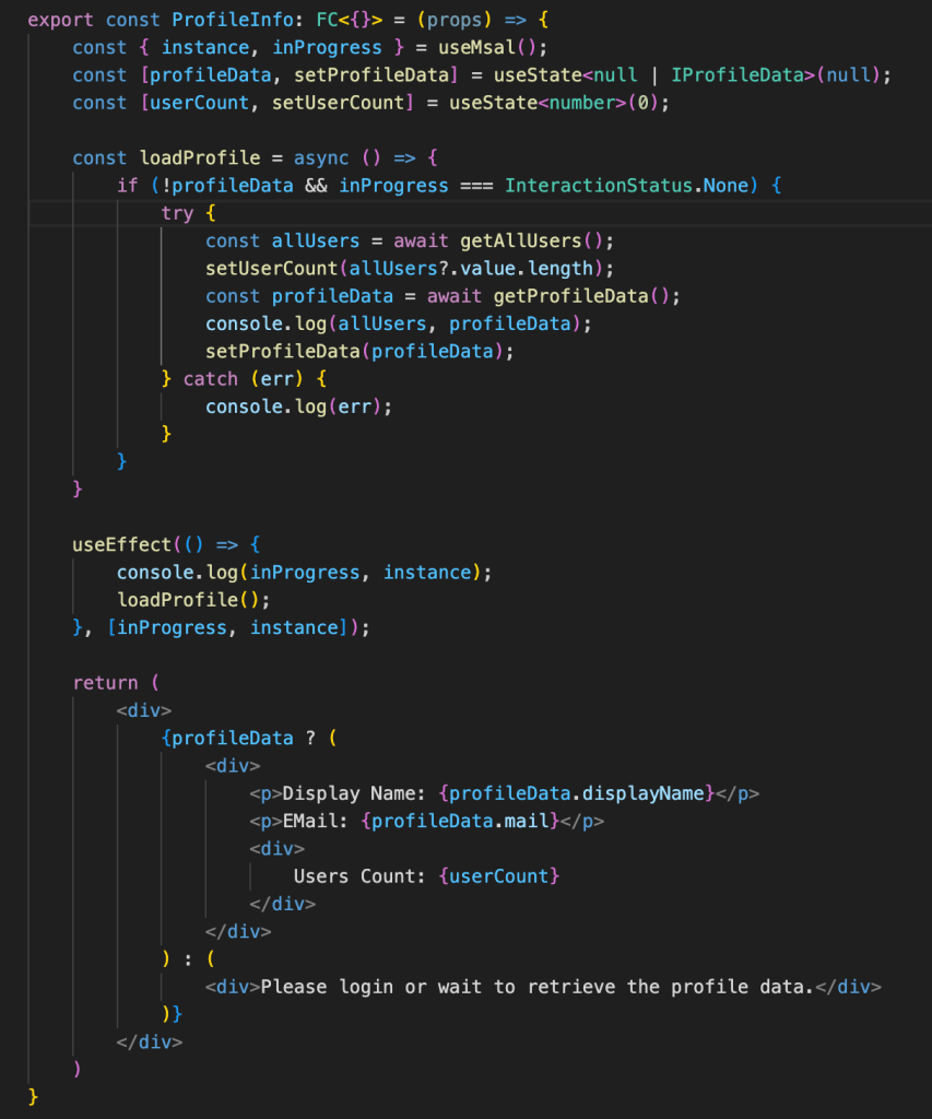 Once the user is successfully logged in, we will show the ProfileInfo which is a small functional component and below is the code.