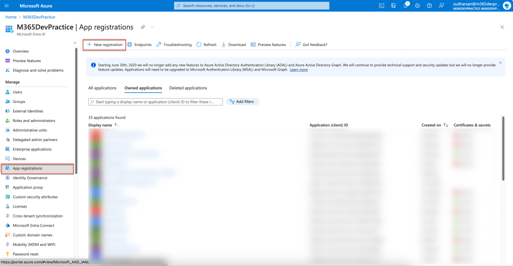 Since we are going to use 2 tenants, we will try to register the app in 1 and try to use the other like a customer tenant. Navigate to portal.azure.com on one of the tenant and click Microsoft Entra ID and from the Left Navigation choose App Registrations.