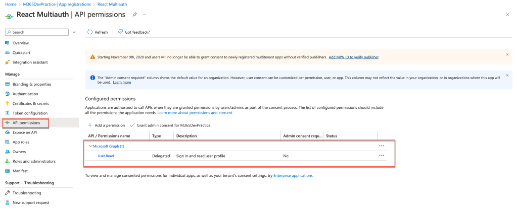 On the left navigation, click on API permissions. By default, User.Read is configured. Using this permission we will be able to retrieve the current user information.