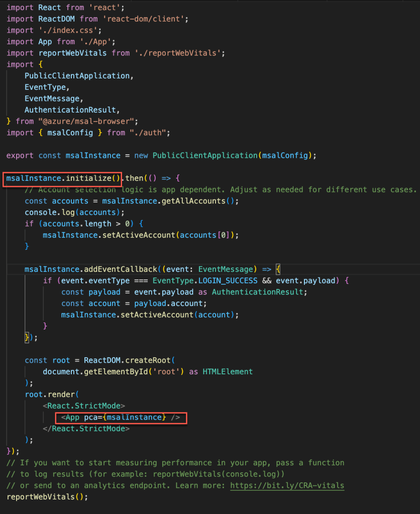 MSAL React should be instantiated outside of the component tree to prevent it being re-instantiated on re-renders. After instantiation, pass it as a props to the application. Below is the index.tsx file.