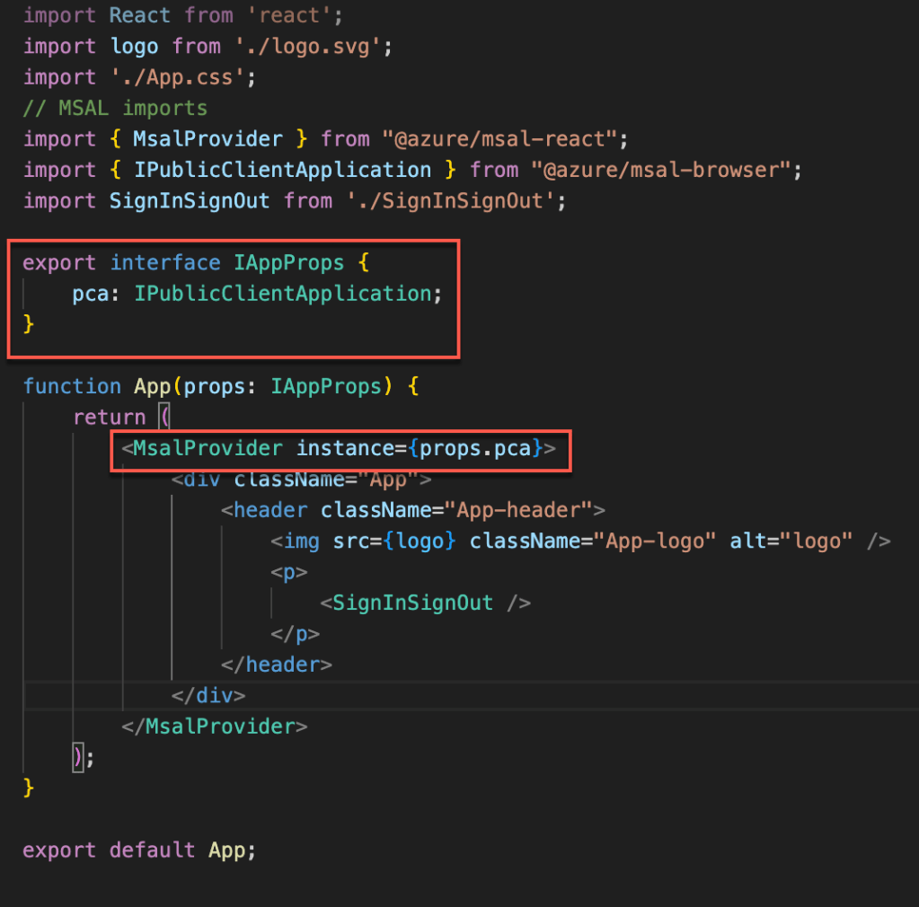 Next is to use the MSALProvider at the top of the component tree which will give us access to the PublicClientApplication instance via context as well as all hooks and components provided by msal-react.