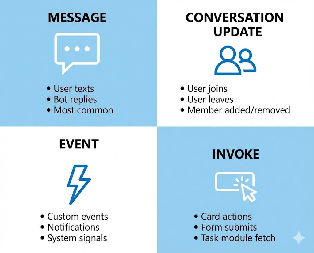 Not all interactions are simple text messages. Users join conversations, click buttons, and trigger events. The Activity Protocol handles all of these with different activity types.
