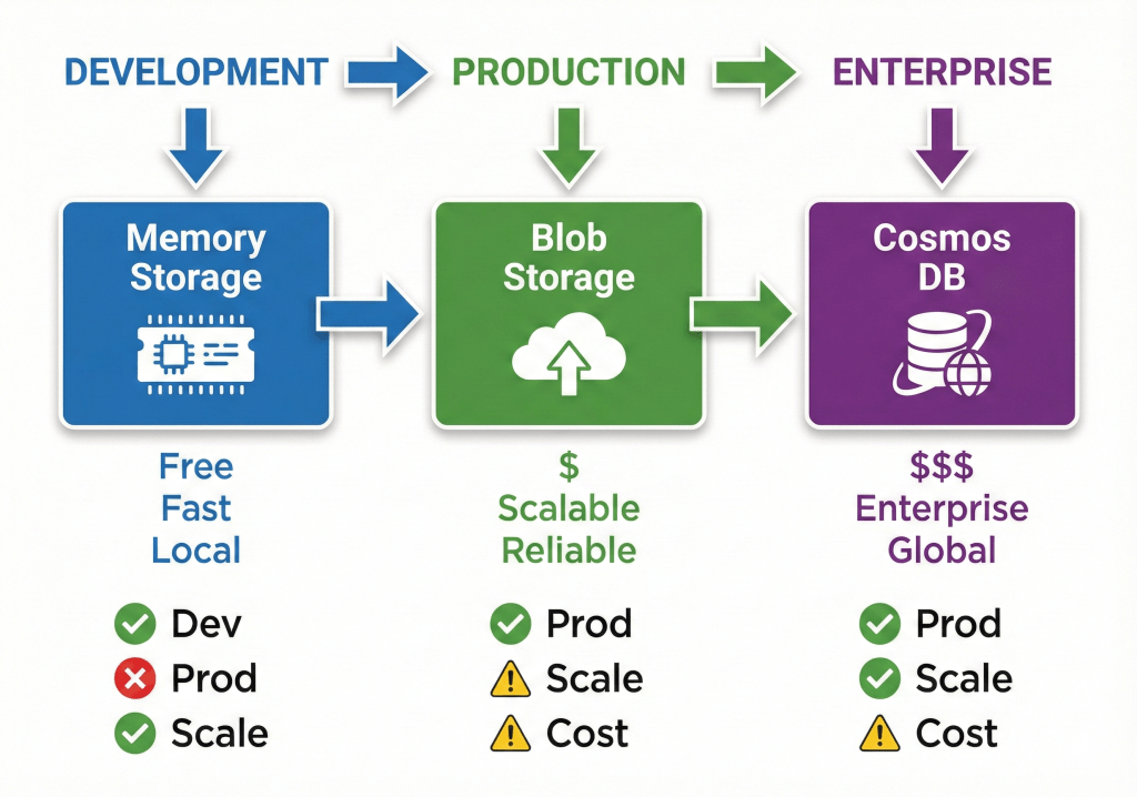 - 💾 Storage Options - Memory (dev), Blob (production), Cosmos DB (scale)