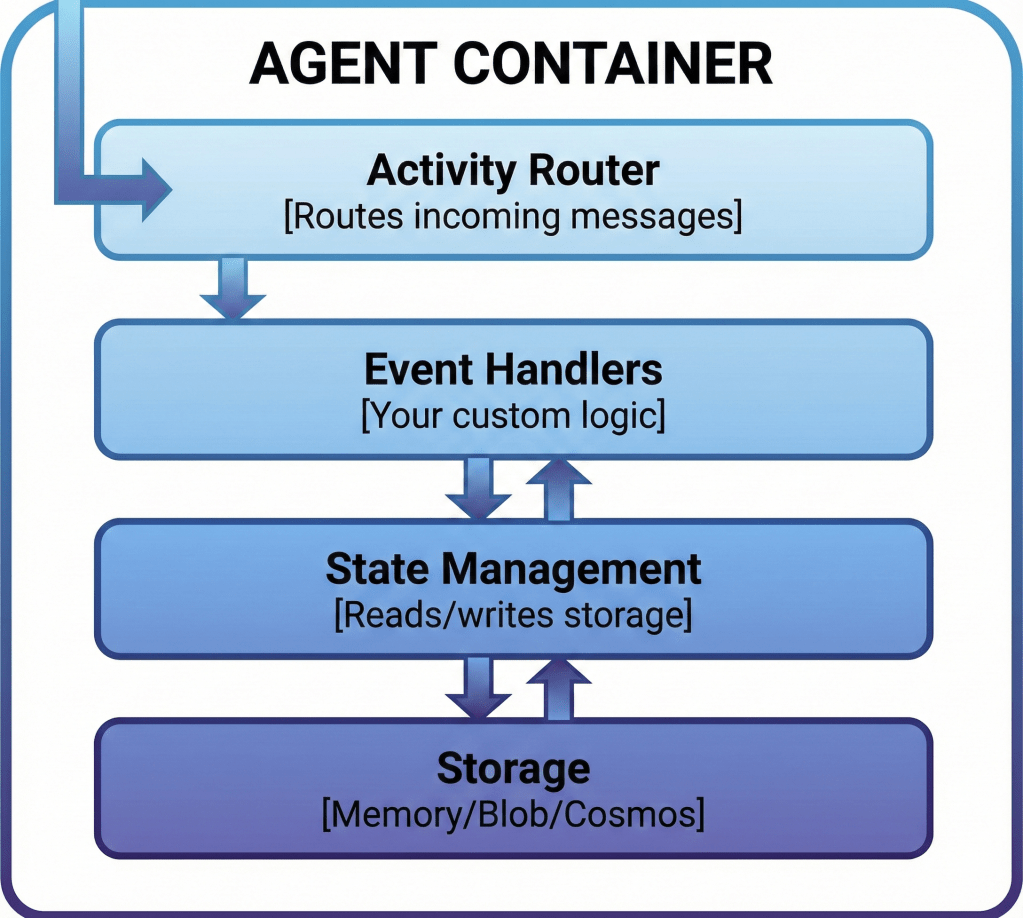 The Agent Container is the core architecture pattern in M365 Agents SDK. Think of it as a smart wrapper around your agent that handles state automatically.